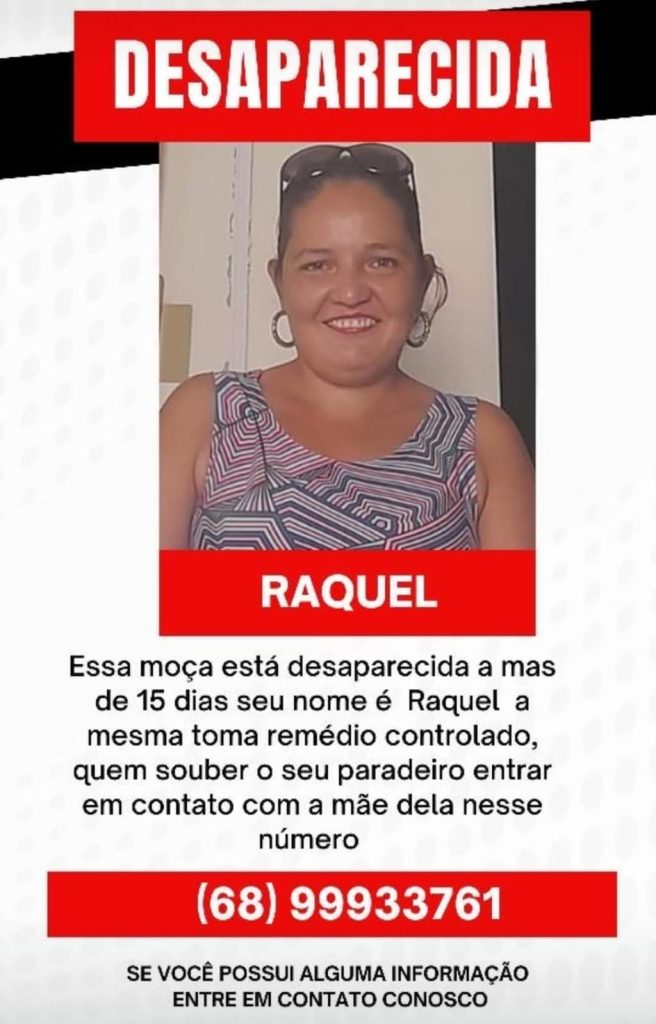Há 19 dias, a família de Raquel Nobre de Lima, 37 anos, vive um drama em Rio Branco: a mulher desapareceu sem deixar pistas. O último contato ocorreu no dia 11 de dezembro, e desde então ninguém sabe para onde ela foi. A irmã, Olivia Nobre, relatou ao Portal Acre que Raquel deixou a casa onde mora, no bairro Ivete Vargas, sem que ninguém a visse saindo.