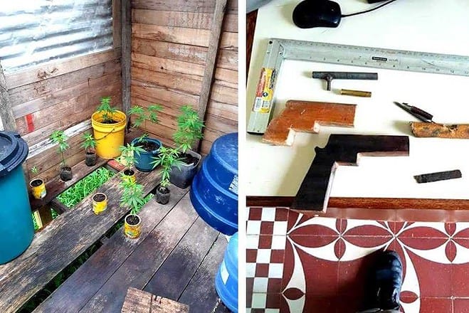 As plantas identificadas como sendo de maconha, armas de madeira e ferramentas foram levados para a delegacia de Polícia Civil.