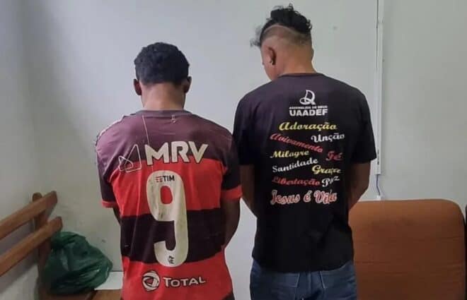 Nossos policiais, após colherem relatos, chegaram a dois indivíduos identificados como Idemátio Araújo de Santo, 26 anos e Ridiomaro Araújo de Souza, de 23 anos, que estariam envolvidos no ocorrido. Durante a abordagem, os suspeitos assumiram a participação no fato e a arma utilizada, uma espingarda calibre 32, foi apreendida.