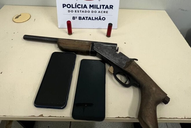 Durante patrulhamento na noite deste domingo, 9, uma guarnição do 8º Batalhão da Polícia Militar do Acre (PMAC) apreendeu dois adolescentes, de 15 e 16 anos, na Estrada Mário Lobão, em Sena Madureira. Os menores estavam em posse de uma escopeta artesanal calibre 28, municiada, e de dois cartuchos intactos.