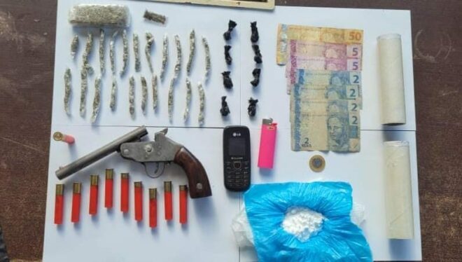 Foi realizado ainda buscas na residência e os militares encontraram, além da arma de fogo, e de 10 cartuchos de calibre.36, 21 barras de substância aparentando ser maconha, 8 porções esbranquiçadas, possivelmente cocaína, e uma quantia em dinheiro. O envolvido é monitorado por tornozeleira eletrônica.
