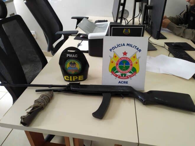 Os militares faziam um patrulhamento na rua Baguari, e avistaram dois indivíduos em uma bicicleta com uma arma de fogo enrolada em um saco. Os policiais solicitaram a parada da dupla, momento que o garupa empreendeu fuga e tentou se esconder em um quarteirão. Os militares conseguiram interceptar o suspeito, onde os policiais conseguiram apreender uma arma de pressão adaptada para calibre 22.