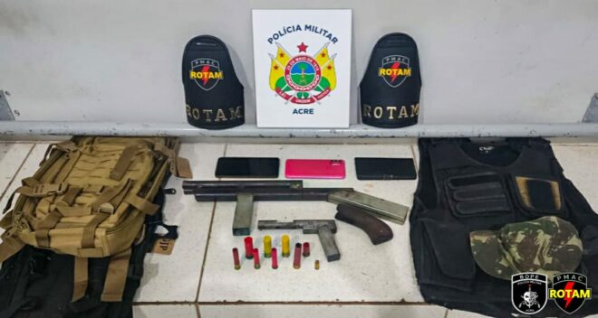 No imóvel foram localizadas duas armas de fabricação caseira, além de 08 cartuchos de variados calibres, aparelhos celulares, capa de colete, mochilas e outros materiais. Dois homens de 22 anos foram presos nessa ação policial.