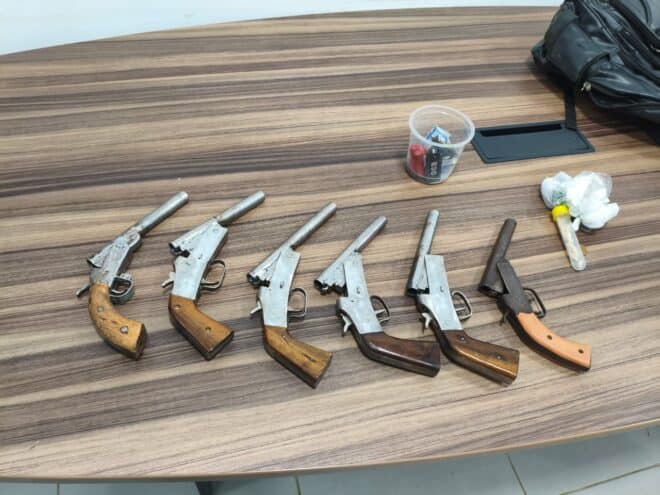 No interior do material foram encontradas seis armas de fogo calibre 28, munições, porções de cocaína, maconha e crack, além de uma quantia em dinheiro. Todo o material apreendido foi encaminhado à Delegacia de Polícia da 2ª Regional para os devidos procedimentos cabíveis.