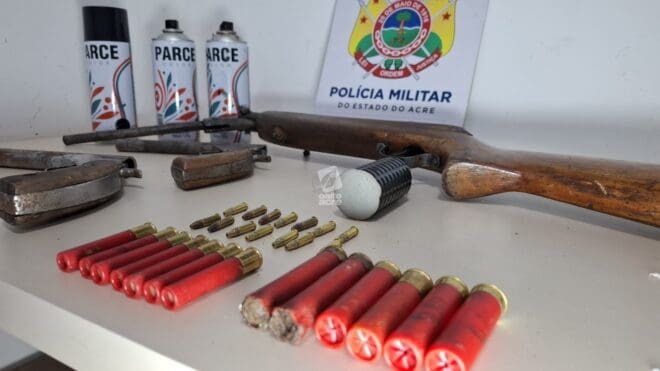 Uma ação da Polícia Militar resultou na apreensão de três armas de fogo, diversas munições e uma granada caseira na noite de quarta-feira (4), na região da Vila Albert Sampaio, no Segundo Distrito de Rio Branco.
