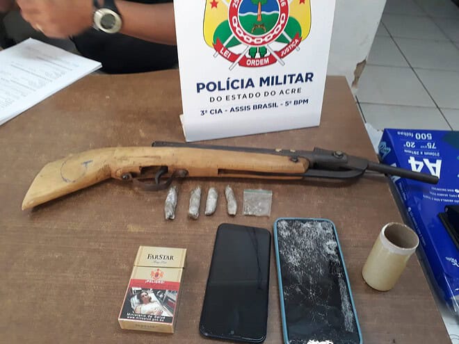 Na tarde desta terça-feira (15), a Polícia Militar do Acre, por meio da 3ª Companhia de Assis Brasil, apreendeu uma quantidade significativa de drogas e uma arma de fogo no Ramal do Icurian, localizado no km 12. A ação ocorreu após uma denúncia sobre dois homens em atitude suspeita, que trafegavam em uma motocicleta sem placa e portavam mochilas.