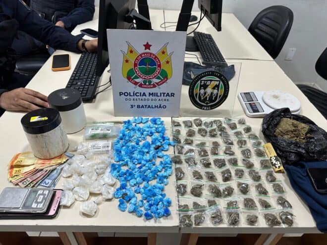 Na tarde desta segunda-feira, 25, a Polícia Militar do Acre (PMAC), por meio de guarnição do 3º Batalhão, apreendeu entorpecentes e diversos materiais utilizados no tráfico de drogas no bairro Montanhês, em Rio Branco.