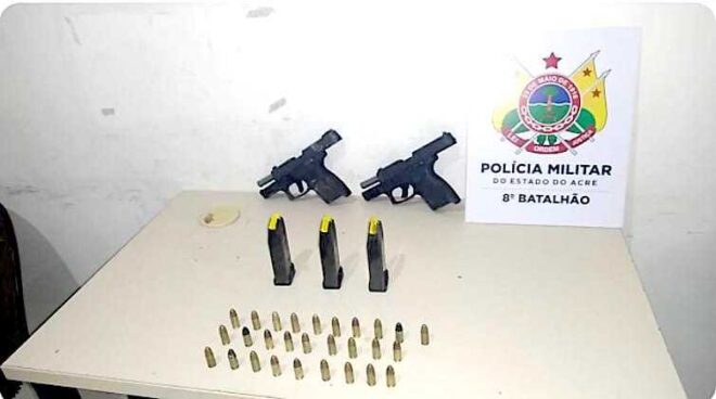 O primeiro fato ocorreu no Porto da Catraia em Sena Madureira, onde a equipe policial do 8º Batalhão prendeu um dupla e com ela foi encontrada duas pistolas 9 milímetros, com três carregadores e 28 munições do mesmo calibre. Os dois estariam se preparando para atacar integrantes de organização criminosa rival.