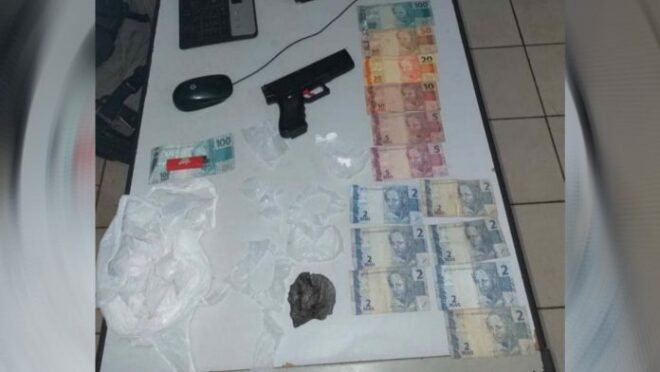 Os policiais realizaram buscas no local e encontraram entorpecentes, dinheiro e um simulacro.