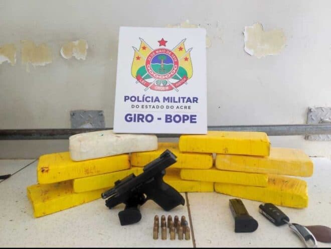 Equipe do Grupamento de Intervenção Rápida Ostenvisa (GIRO) apreendeu na manhã desta terça-feira, 2, mais de onze quilos de drogas, arma de fogo e munições no bairro Rosa Linda, em Rio Branco. Um homem de 33 anos foi preso no local.