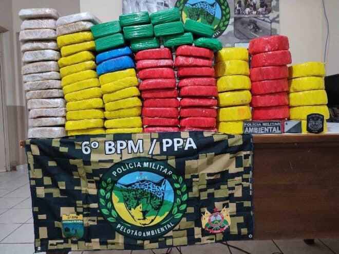 Segundo os policiais, durante rondas rotineiras nos ramais da região, o condutor do veículo desobedeceu às ordens de parada para uma abordagem, furando o bloqueio e fugindo em alta velocidade. A guarnição seguiu o veículo, mas o motorista abandonou o carro e fugiu por uma área de mata. Dentro do veículo, foram encontrados quatro sacos contendo cerca de 82 quilos da droga, divididos e embalados no formato de “tijolos”.