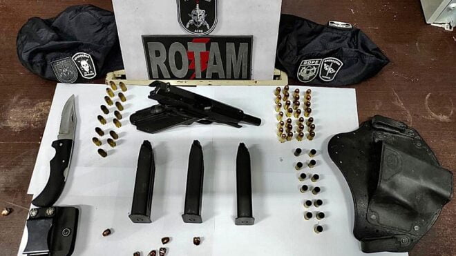 No imóvel foram apreendidas 01 pistola, com 03 carregadores, 01 maleta de transporte, 01 porta carregador, 01 coldre e 43 munições. O cidadão foi atendido pelo Serviço de Atendimento Móvel de Urgência (SAMU) e encaminhado ao Hospital de Saúde Mental do Acre (Hosmac), para atendimento especializado.