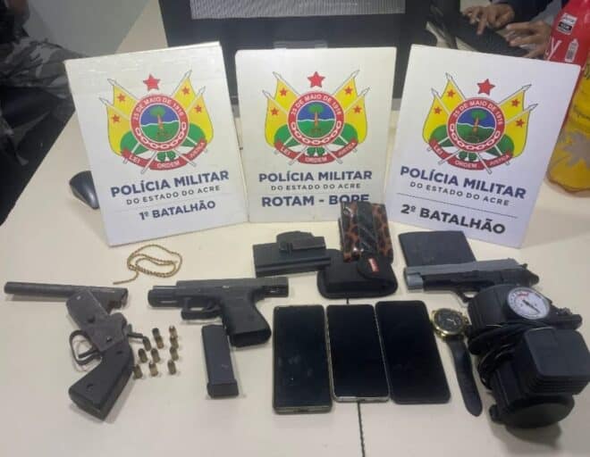 Com eles, foram recuperados os objetos roubados, incluindo a arma de fogo da vítima, celulares, uma mochila e outros itens. Além disso, foram apreendidas as armas utilizadas no crime: uma garrucha artesanal calibre 28 e um simulacro.