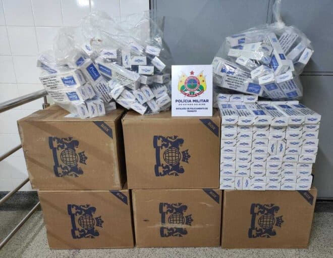 Dos três veículos, a guarnição, após um acompanhamento, conseguiu realizar a abordagem de um deles, um Siena Branco, sendo encontrado em seu interior 700 maços de cigarro da marca Point. O homem e o material foram apresentados na superintendência da Polícia Federal no Acre (DPF/AC).
