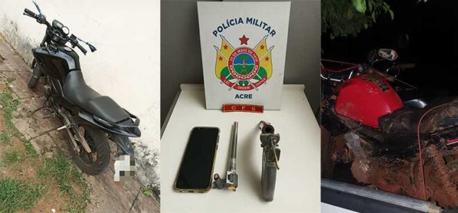 Equipes da Polícia Militar do Acre (PMAC) durante a quinta e sexta-feira, 30 e 31, conseguiram apreender uma arma de fogo e recuperar três motocicletas roubadas. As ocorrências se deram em Plácido de Castro e Rio Branco, onde foi preso um homem de 33 anos.
