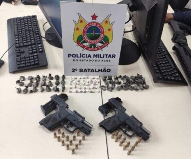 Dois indivíduos foram presos pela Polícia Militar do Acre (PMAC) na tarde deste sábado (15), no bairro Amapá, em Rio Branco. Os suspeitos estavam portando duas pistolas 9mm e substâncias entorpecentes, incluindo cocaína e crack. A ação ocorreu próximo ao ramal Holiday, no loteamento Praia do Amapá, durante uma operação do grupamento tático do 2° Batalhão da PMAC (2º BPM).