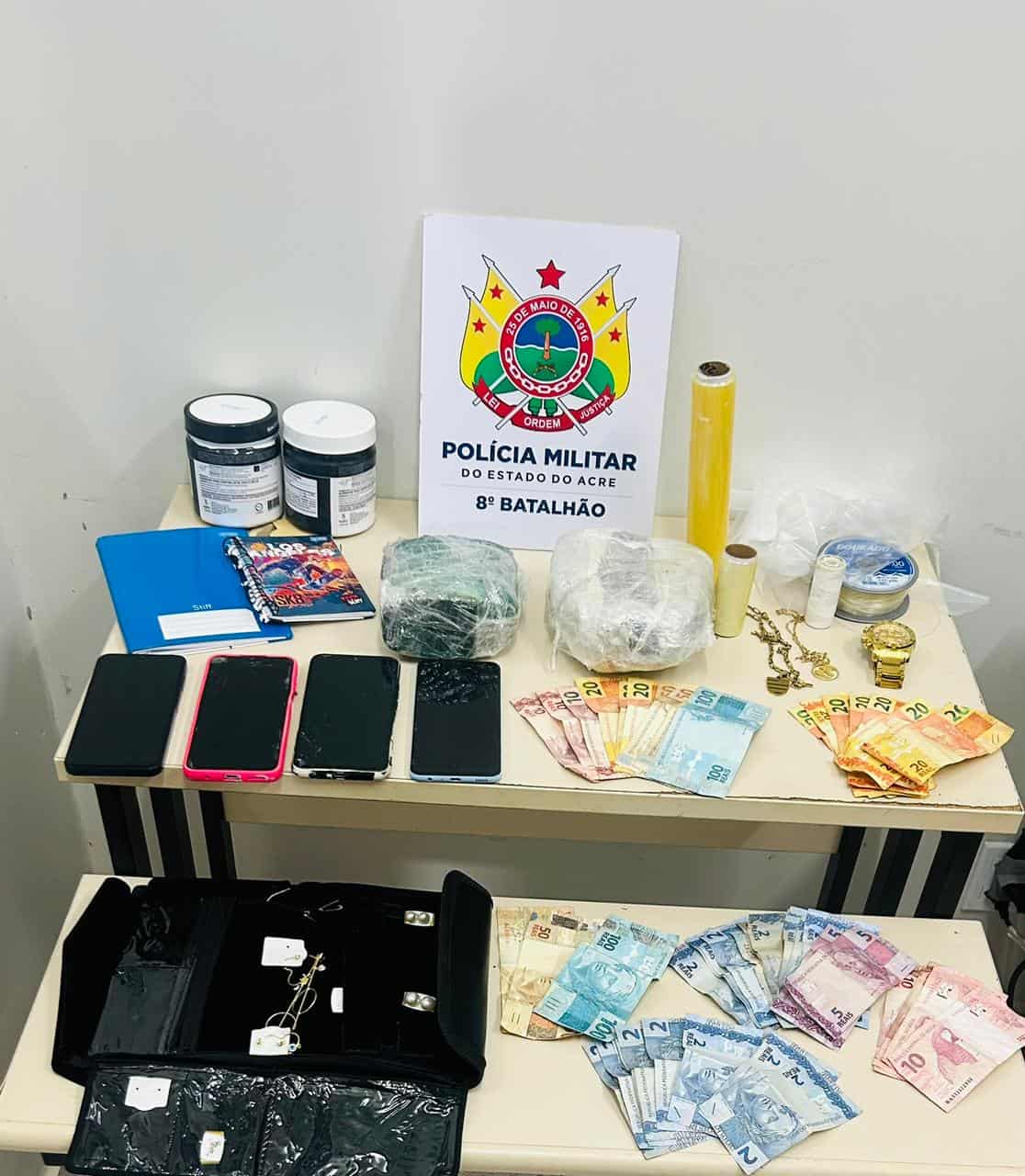 Na revista realizada dentro da residência, os policiais encontraram materiais usados para embalar drogas, como papel filme, linha e potes de creatina, além de dois cadernos com anotações referentes à venda de entorpecentes. Também foram apreendidos três aparelhos celulares, um deles pertencente a um adolescente conduzido à delegacia no dia anterior, além de R$ 804 em dinheiro.