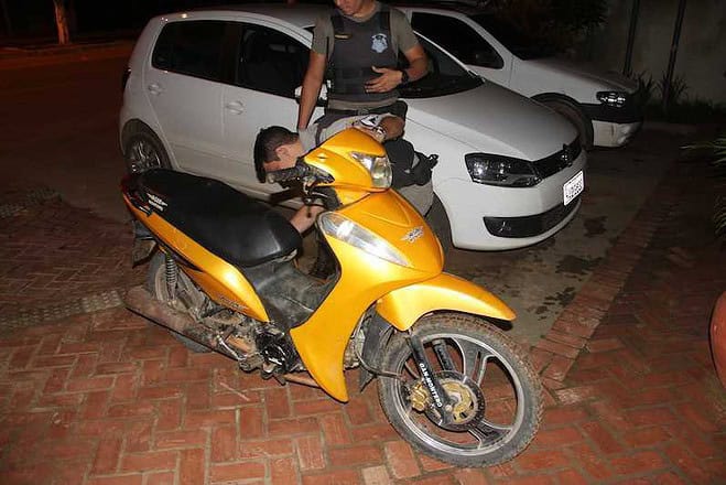 Próximo a meia-noite, dois jovens foram até o local e quando se aproximaram para sair na moto, foram surpreendidos e rendidos pelos policiais. Edmar de Souza (22) e um menor de 16 anos, foram conduzidos para a delegacia juntamente com o veículo.