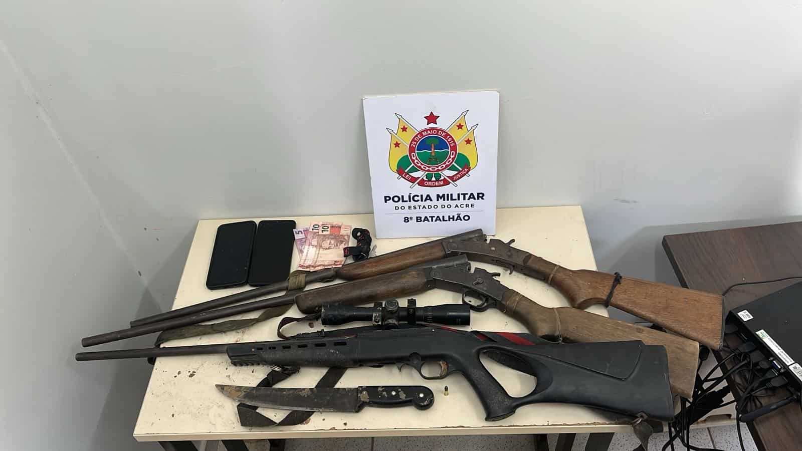 Além das armas, foram apreendidos celulares, uma quantia em dinheiro, munição calibre .22, uma faca e o quadriciclo vermelho roubado, que foi recuperado após buscas complementares realizadas pela Patrulha Rural. Os suspeitos e o material apreendido foram encaminhados à Delegacia de Polícia Civil de Sena Madureira para os procedimentos cabíveis.