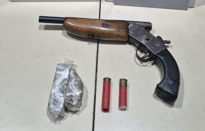 Ao chegar ao endereço informado, a equipe localizou os dois suspeitos. Ao perceber a presença policial, um deles, de 25 anos, arremessou uma mochila para o interior de um quintal vizinho. Após a abordagem e a verificação do material descartado, foram encontrados certa quantidade de skunk droga conhecida como “super maconha”, uma arma de fogo artesanal calibre .28, municiada com dois cartuchos, além de um celular e objetos pessoais.