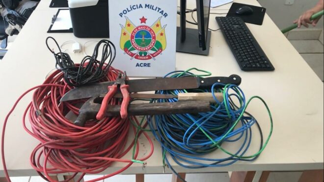 Militares realizavam patrulhamento de rotina quando visualizaram um cidadão colocando alguns rolos de fio de cobre na mochila. A guarnição procedeu a abordagem, e encontrou três rolos grandes de cobre, além de material utilizado para retirada dele, como alicate, terçado, martelo, entre outros.