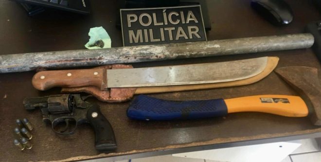 Durante as buscas na residência, com a ajuda do cão policial, foi encontrada uma trouxinha de maconha e, em uma caixa de gordura, o revólver Taurus calibre .32 no modo “engatilhado”, com cinco munições intactas e uma percutida. No interior da caminhonete do suspeito, foram localizados ainda uma barra de ferro com aproximadamente 65 centímetros, um terçado com bainha e uma machadinha.