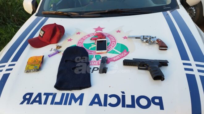 Quando foram abordados e revistados, foi localizado na cintura do garupa, de 18 anos, uma arma de fogo modelo pistola calibre 9 milímetros municiada e logo foi dado a ordem de deitarem no chão e o condutor ao ser revistado, também foi localizada outra arma, um revolver calibre 38 municiado também.