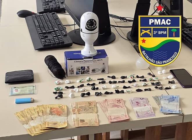 A primeira ocorrência foi registrada no Beco da Rua Pequena Jéssica, área conhecida por ser ponto de venda de entorpecentes. Durante patrulhamento, um homem tentou fugir ao perceber a presença da guarnição, mas foi rapidamente abordado. Em sua posse foram encontrados 45 invólucros de cocaína escondidos em uma lâmpada, R$ 337,00 em dinheiro, uma sacola com material para embalar drogas e uma câmera Wi-Fi utilizada para monitorar a movimentação policial. O suspeito foi preso em flagrante por tráfico de drogas e encaminhado à Delegacia de Flagrantes (DEFLA).