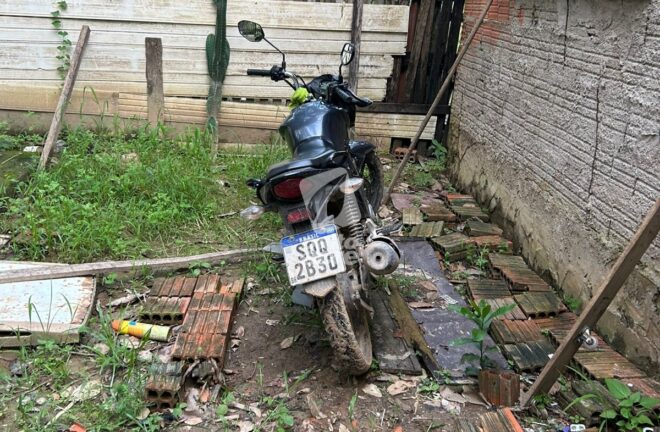 Com o apoio de outra equipe, os policiais realizaram buscas no terreno e localizaram uma Honda Fan cinza, modelo 2023, placa SQQ2B30. Após consulta ao sistema, foi confirmado que a motocicleta estava com restrição de roubo, registrada no último sábado (22).