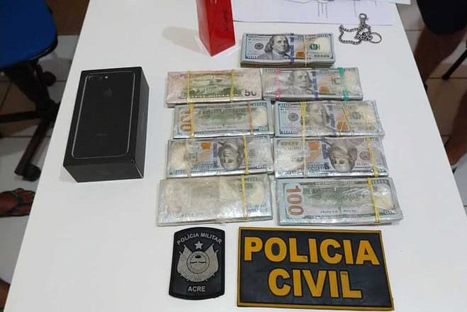 Uma operação conjunta da Polícia Civil e Militar do Acre apreendeu 79 mil dólares na cidade de Cruzeiro do Sul, distante 631 km da capital Rio Branco, na noite desta quarta-feira, 6. A abordagem teria sido feita em das avenidas principais da cidade e três pessoas de uma mesma família foram presas. Tratam-se de Lucas Martins, Gleidison Martins e um menor de idade.
