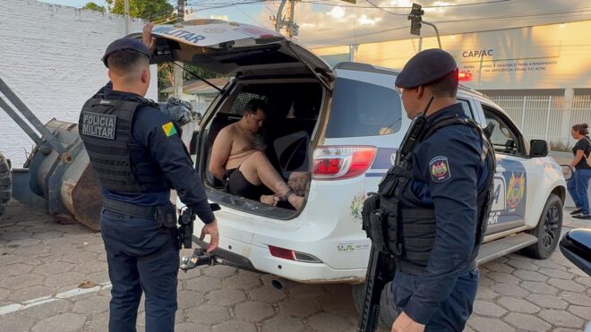 Uma ação rápida da Polícia Militar do Acre impediu a execução de Cleber Souza Lima, de 36 anos, na tarde desta quinta-feira (31), no bairro Cidade Nova, região do Segundo Distrito de Rio Branco. Os faccionados Denes Esteves Santana da Silva, de 28 anos, e Atos Nascimento Freitas, de 27 anos, conhecido como “Menor das Chapas”, foram presos em flagrante, acusados de torturar e tentar matar a vítima com disparos de arma de fogo.