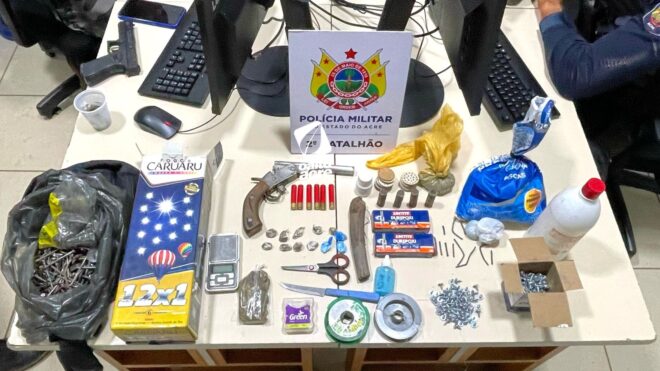 Em uma ação realizada na noite de domingo (20), policiais militares da Força Tática do 2° Batalhão prenderam um foragido da justiça com um arsenal de armas, drogas e materiais para fabricação de explosivos no Conjunto Habitacional Cidade do Povo, em Rio Branco.