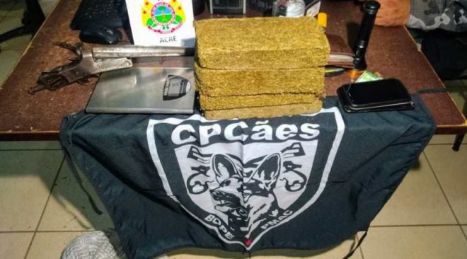 Os policiais, que contaram coma a ajuda da Companhia dos Cães (CEP Cães), receberam uma denúncia de que dois homens estariam transportando drogas em um ônibus que fazia a linha da Vila Verde, localizada no quilômetro 58 da estrada Transacreana.
