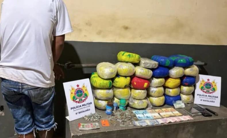 Uma operação conjunta das Polícias Militar e Civil resultou na prisão de Cauê Silva dos Santos, 20 anos, e na apreensão de 30 quilos de maconha no bairro Miritizal, em Cruzeiro do Sul, no último domingo (17). De acordo com o Major Abraão Silva, comandante da PM local, o suspeito tentou fugir ao avistar os agentes, mas foi detido após jogar no chão uma faca que carregava na cintura.