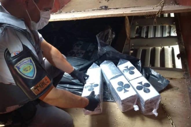 Desconfiados, os policiais resolveram realizar vistoria no compartimento de carga e localizaram um assoalho falso entre os eixos do semirreboque contendo grande quantidade de cocaína. Ao todo, foram encontrados 510 tabletes, que somaram 550 quilos.