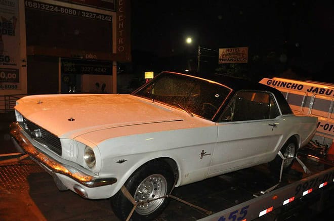 Agentes da Polícia Rodoviária Federal realizavam uma ronda de rotina na BR 317, na noite desta quarta-feira (30), quando avistaram um caminhão transportando, através de um guincho, um veículo modelo Mustang, do ano de 1965.