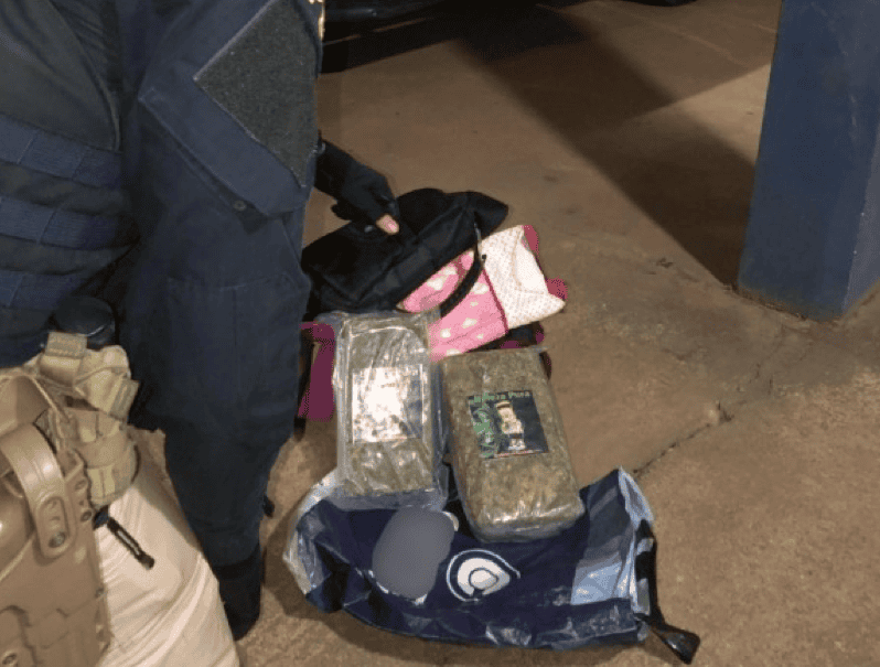 Ao ser questionada sobre a presença de algum ilícito e o conteúdo de sua bagagem, a passageira permitiu a inspeção de sua mochila. Dentro dela, foram encontrados dois invólucros contendo aproximadamente 2,040 kg de substância com características análogas à maconha.