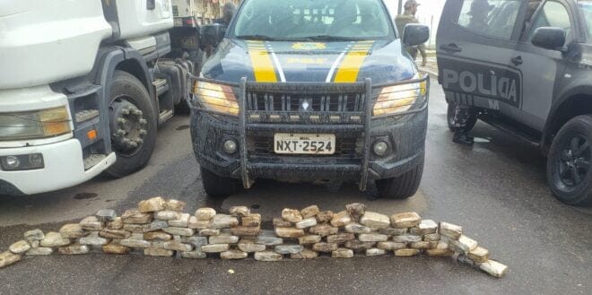 Policiais militares e policiais rodoviários federais apreenderam 58 quilos de entorpecentes, durante abordagem no Km 115, da BR 364. A ação teve início no sábado e conclusão no domingo, 24.