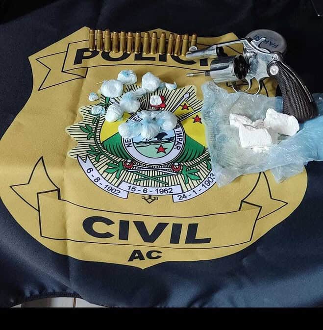 Por volta das 10:20 desta Quarta-Feira, Investigadores da delegacia de Brasiléia no momento em que realizavam diligência no bairro Leonardo Barbosa tiveram a informações de transeuntes de um ponto de venda de drogas no local. Os policiais se deslocaram até o endereço indicado e após autorização do morador L. C. N, de 22 anos os mesmos encontraram escondidos no interior do imóvel várias trouxinhas de cocaína, pesando um total de 88 gramas e um revólver calibre .38 com 13 munições intactas.