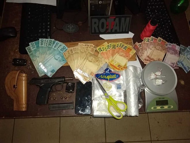 Com o indivíduo, foram encontradas três trouxinhas de substância aparentando cocaína e uma arma de fogo calibre .380, em uma gaveta apontada por ele. Na residência, foram localizados ainda uma balança de precisão, um celular, além de vários materiais utilizados para o embalo de entorpecentes e o valor de 3.906 reais em cédulas diversas.
