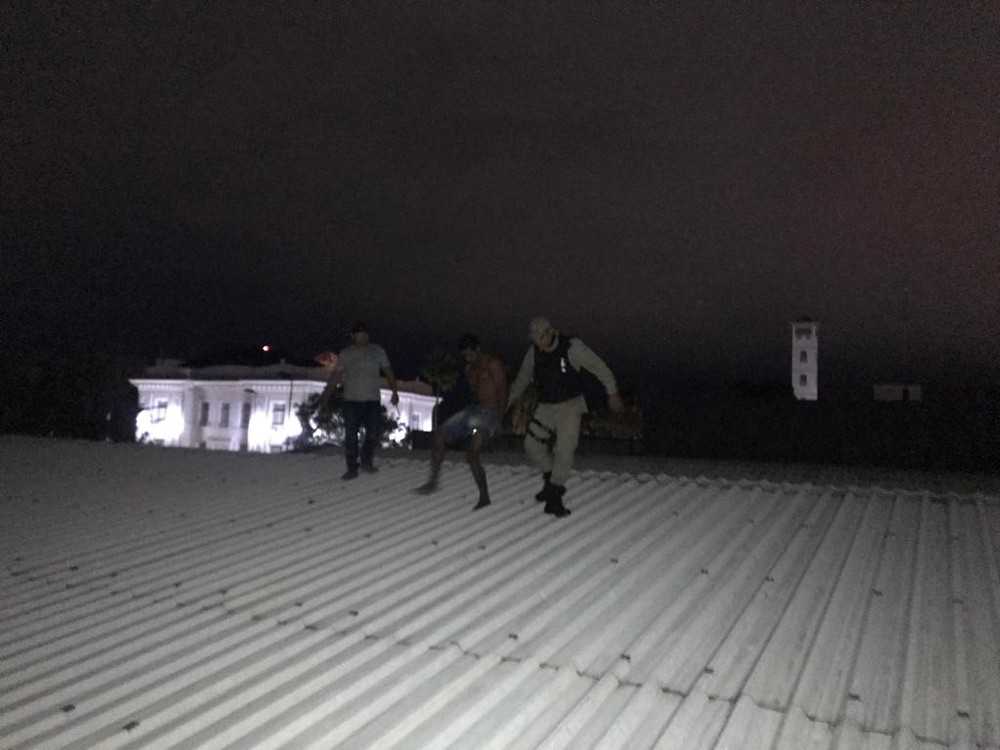 Policiais militares sobem em telhado de loja no Acre para prender homem que furtava fios