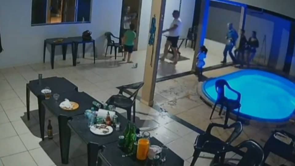 Por outro ângulo, poucos segundos depois das agressões, é possível acompanhar quando o policial se afasta da piscina no espaço de lazer da casa, onde o irmão dele já não se encontra mais no local.