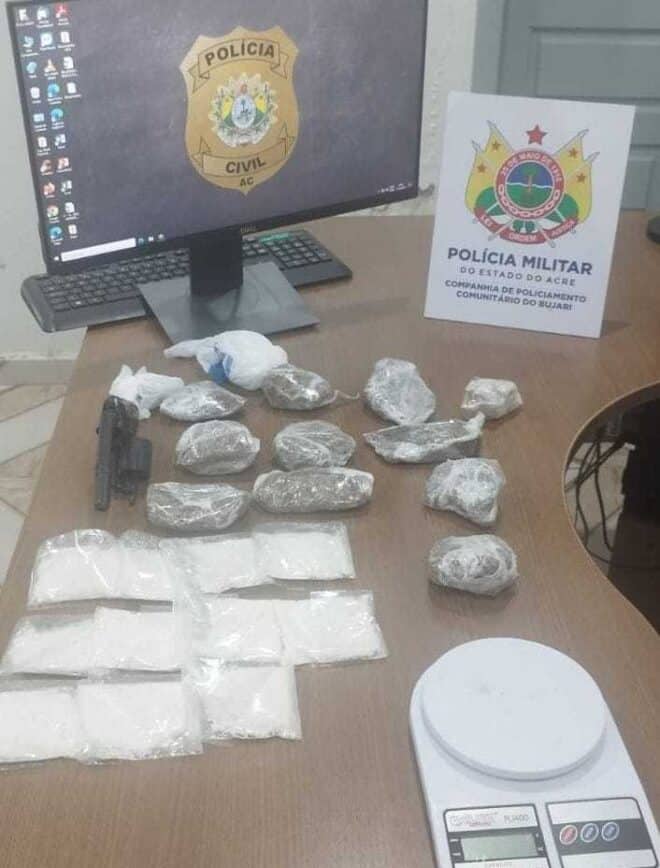 Durante cumprimento de um mandado de busca e apreensão no município do Bujari, policiais militares e civis apreenderam na manhã desta terça-feira, 11, uma arma de fogo, munições e cerca de um quilo de drogas. As buscas foram realizadas em três casas, e resultaram na prisão de um membro de uma organização criminosa que está sendo investigado por tráfico de drogas e porte ilegal de arma de fogo.