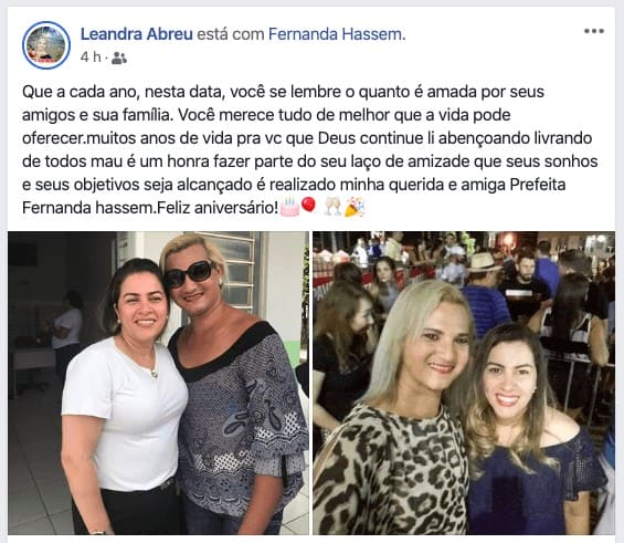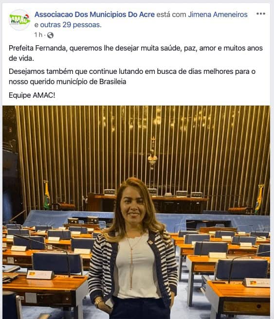 “Essa é uma pequena lembrança que não poderia deixar passar em branco… Estou falando da Fernanda prefeita (…), amiga da minha esposa Marfisa e amiga do Petecão. (…) Eu tenho um carinho especial por você e da prefeita que tem uma boa gestão e ouço isso da população de Brasiléia e essa data não poderia passar em branco e desejar para você toda a felicidade do mundo e que possa alcançar todos os seus sonhos (…)”, destacou o senador Sérgio Petecão.