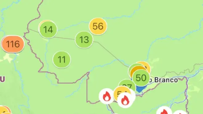 De acordo com a plataforma, Rio Branco tem o pior nível de poluição suspensa no ar entre as cidades acreanas, com 17.8 µg/m³ (microgramas de partículas finas inaláveis por metro cúbico), 3.6 vezes o valor recomendado na diretriz anual da Organização Mundial de Saúde.