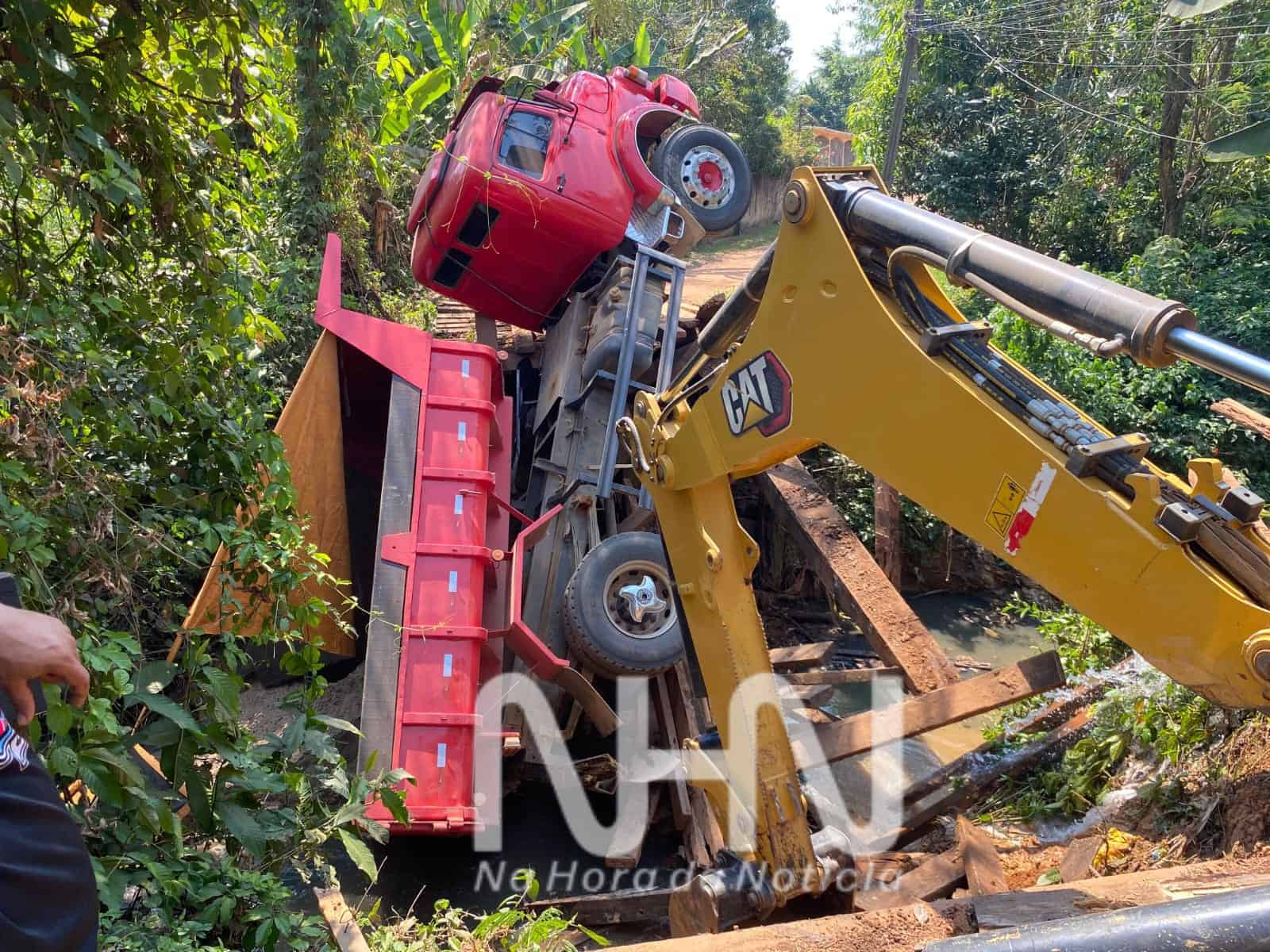 Segundo informações de testemunhas, uma caçamba trafegava no sentido centro-bairro carregada de areia, quando passou sobre uma ponte de madeira que não suportou o peso do veículo e acabou desabando. A caçamba caiu dentro do córrego, causando um grande prejuízo ao proprietário. Na queda, o motorista da caçamba não ficou ferido.