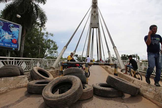 A fronteira do Acre, que é ligada por duas pontes, está fechada por tempo indeterminado. O bloqueio aconteceu na tarde desta quarta-feira, dia 01, por familiares do acreano Sebastião Nogueira do Nascimento (33) que se encontra preso no lado boliviano de Cobija, capital do estado de Pando, por volta das 16h30.