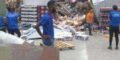 Outro vídeo que circulou pelas redes sociais mostra uma longa pilha de produtos de gêneros alimentícios entre outros nos escombros.
