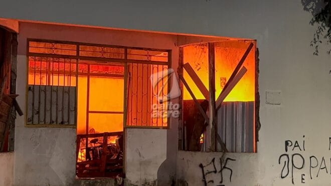 Um prédio abandonado foi incendiado na noite desta quinta-feira (28), na Rua Alagoas, bairro Bosque, em Rio Branco. O imóvel, frequentemente utilizado como abrigo por pessoas em situação de rua, foi tomado pelas chamas por volta das 18h30.