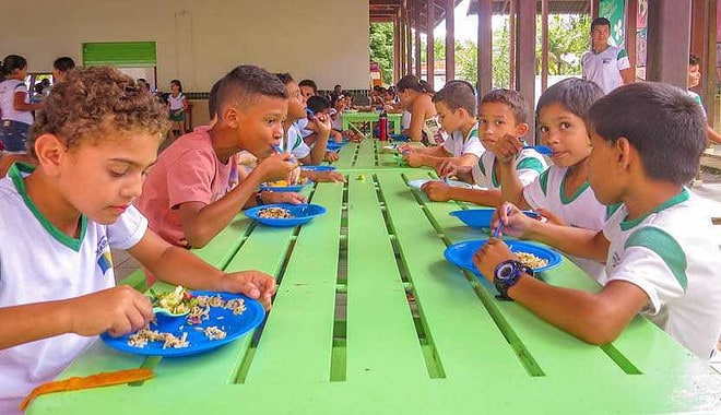 É a hora do intervalo e os professores começam a liberar seus alunos para a merenda, começando dos menores para os maiores, em fila eles se dirigem até a pia para lavar as mãos, passam sabão liquido, enxaguam as mãos e se dirigem até a mesa onde está servida a refeição, tem feijão preto, arroz, salada, limão e mamão. Cada estudante começa a se servir e vão comer, assim é a rotina na escola municipal José Ruy Lino da Silveira desde a volta dos investimentos da prefeitura na complementação do recurso na merenda das escolas de Brasileia.